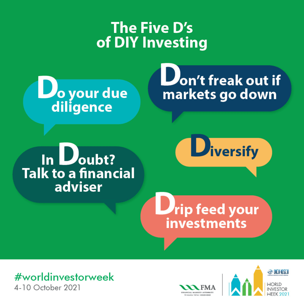 The FMA’s theme for the week is ‘Investing FOMO – take a mo’ and the FMA will be urging investors to consider the 5 D’s of DIY investing: due diligence, diversification, drip feed investments, seeking advice if in “doubt”, and “don’t freak out if markets go down.”